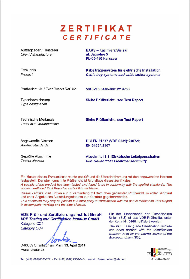 Certificate VDE – Electrical Continuity of Tray and Ladder Long Span